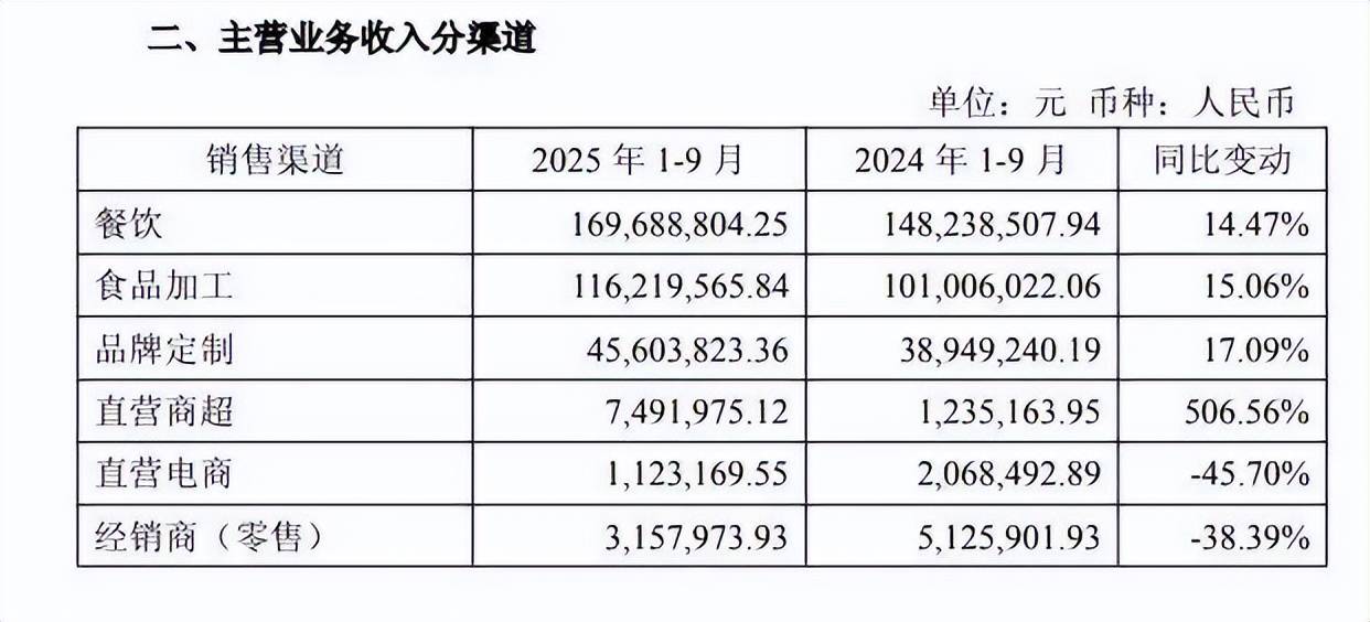 粉体类调味料也有面向食物加工企业、餐饮企业的定制化产物,包罗裹粉裹浆、腌制类调味粉、复合汤粉、预拌粉等;还有面向餐饮企业和家庭烹调的尺度化系列产物,包含烧烤系列、喷鼻炸系列、浓汤系列等。值得一提的是,日辰股份通过收购嘉兴艾贝棒食物无限公司,还将营业范畴拓展至了烘焙类冷冻面团范畴,为客户供给冷冻面团,只用经解冻及烘烤等简单工序,即可加工成披萨、面包等产物。其曾正在2025年半年报透露,公司目上次要面向三大市场,别离为:调度食物的出口和内销市场、国内餐饮特别是连锁餐饮市场,以及国内零售终端消费市场。客岁前三季度,公司总营收3。44亿元,来自餐饮的收入为1。70亿元,占比接近五成。