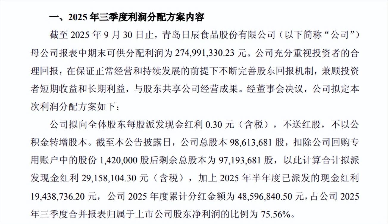 前不久,青岛日辰食物股份无限公司(下称“日辰股份”)集中披露多份通知布告,涵盖2025年三季度利润分派方案、初次公开辟行股票募投项目全面结项,以及《“提质增效沉报答”步履方案》。通知布告中,日辰股份透露上市以来公司累计实施现金分红达2亿元;别的,公司实行持续、不变的利润分派政策,每年现金分红金额占昔时归属于上市公司股东净利润的比例均超35%。其还指出,2025年,公司实施两次中期利润分派方案,合计向全体股东每股派发觉金盈利0。50元(含税),累计派发觉金盈利将超4800万元。