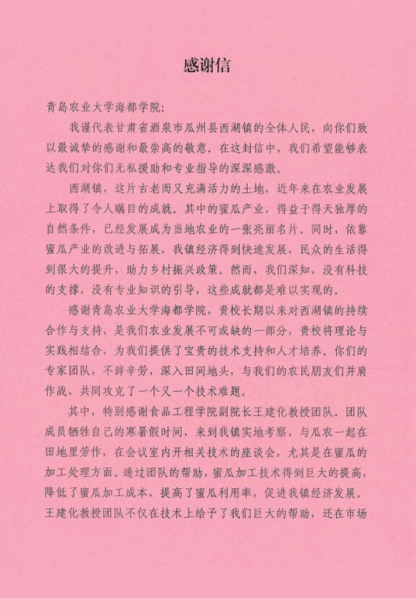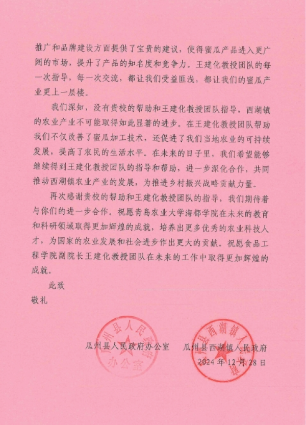 近日,青岛农业大学海都学院食物工程学院副院长王建化传授及其团队,收到了来自本地满载感谢感动之情的感激信。这不只是对王建化传授团队奉献的高度承认,更是对该校科研、办事处所经济成长能力的无力证明。